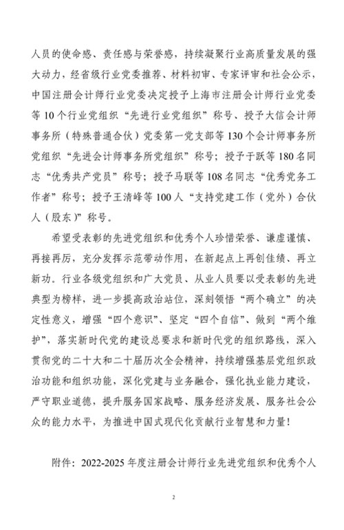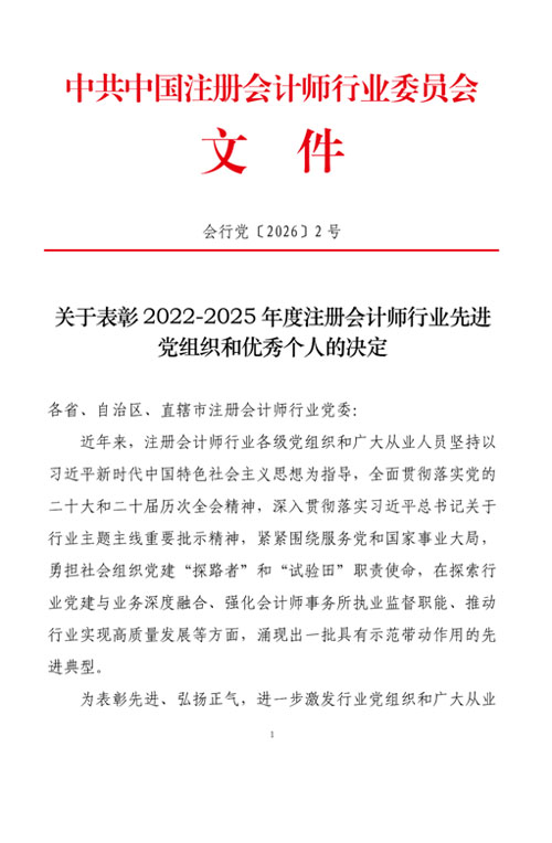 近日,收到中共中國注冊會(huì)計(jì)師行業(yè)委員會(huì)文件《關(guān)于表彰2022-2025年度注冊會(huì)計(jì)師行業(yè)先進(jìn)黨組織和優(yōu)秀個(gè)人的決定》,我所主任會(huì)計(jì)師吳林海同志榮獲注冊會(huì)計(jì)師行業(yè)“優(yōu)秀黨務(wù)工作者”稱號(hào)。 此次榮獲“優(yōu)秀黨務(wù)工作者”稱號(hào),不僅是對其個(gè)人工作的認(rèn)可,也是對我所黨建工作的高度肯定。 我所將以此次獲獎(jiǎng)為契機(jī),進(jìn)一步加強(qiáng)黨建工作,深化黨建與業(yè)務(wù)融合,提升服務(wù)質(zhì)量,堅(jiān)守職業(yè)道德,不斷增強(qiáng)服務(wù)國家戰(zhàn)略、服務(wù)經(jīng)濟(jì)發(fā)展、服務(wù)社會(huì)公眾的能力。 附件: